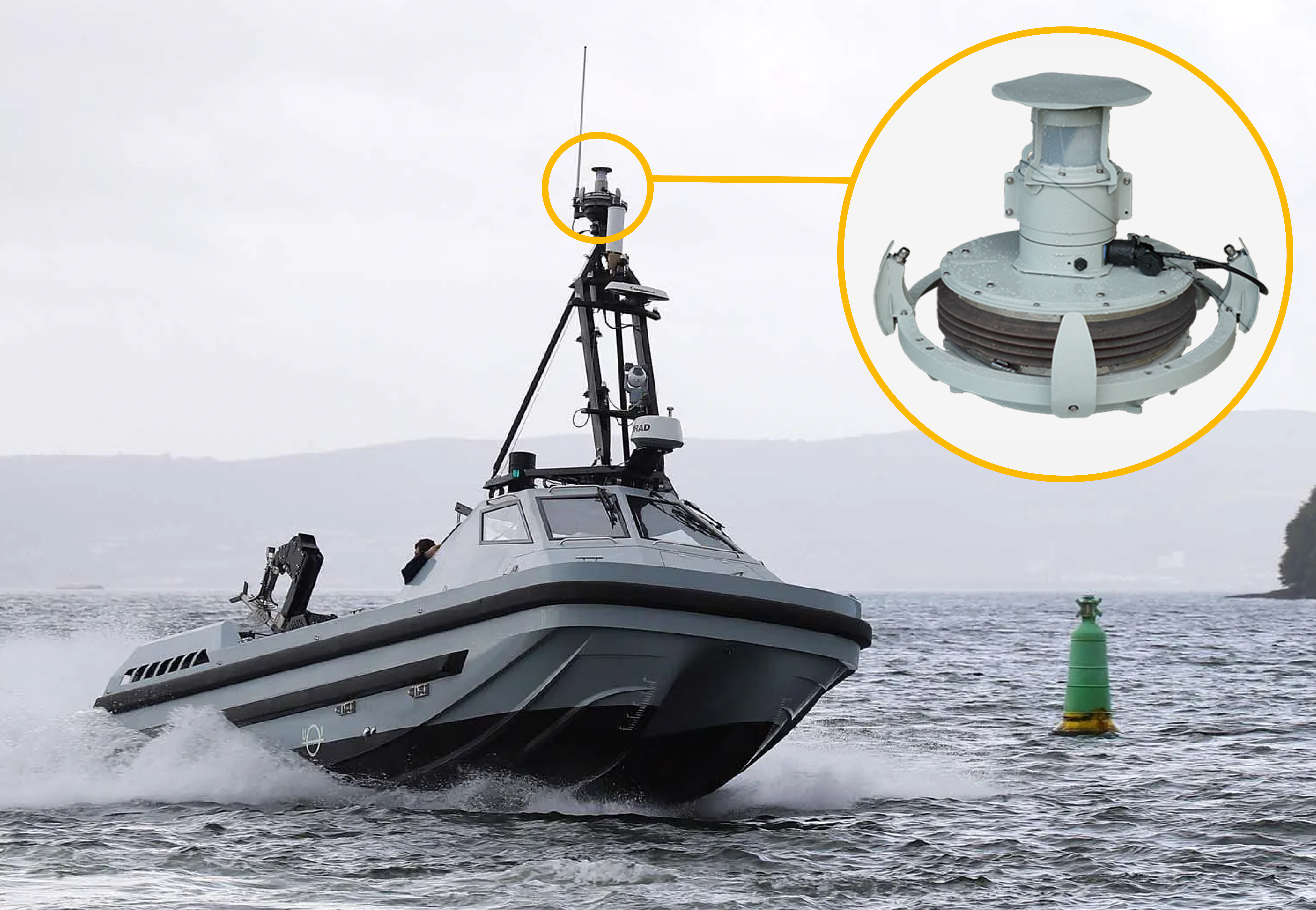 The RSM 50 is specifically designed for marine applications to ensure perfectly stabilized data capturing of sensor systems in rough environments. The ruggedized Mount is used by a customer in combination with a high resolution panoramic thermal camera on an Unmanned Surface Vessel. The Mount compensates roll and pitch movement of the USV caused by vessel motions in the swell. The installed 360°-sensor is located in an elevated mast position. They Mount ensures a stabilized field of view of the panoramic environment. In this example, the Gyro Mount is part of the collision avoidance system that allows the USV to detect and avoid obstacles at an early stage during unmanned missions.